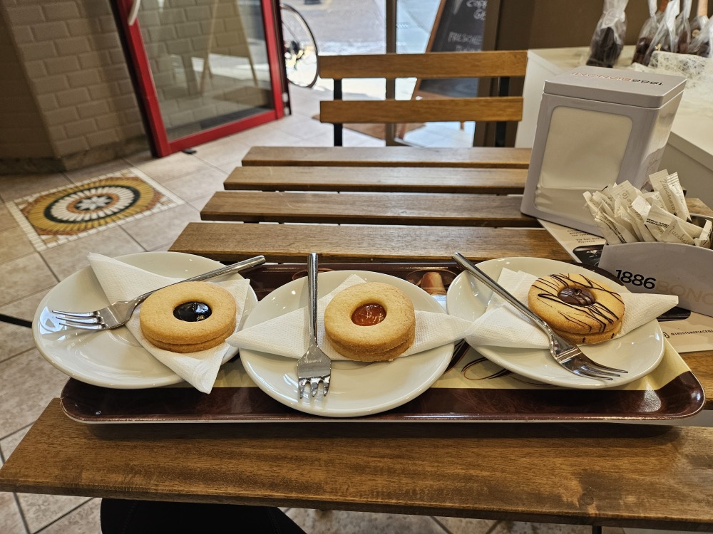 - a break in chocolaterie, ran by mother and son, only the son spoke little bit of English, I ordered three pieces of small biscuits and got them on three plates on a tray, it felt slightly awkward as I ate them after the clumsy and lengthy ordering dialogue, the awkwardness was mutually confirmed as I heard the staff exclaim: “Mama mia!” after I left the shop :-)