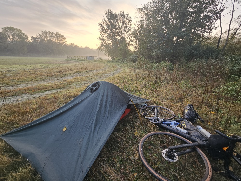 - I cannot wait for the morning – I’m woken by cold, I don’t understand it, the sleeping bag should be comfortable down to 1°C and the forecast predicted ~9°C, it’s explained when I check the thermometer on Garmin that (also) spent the night ~20 cm above the ground – it reads 4°C, however, when I stood the bike upright, the Garmin on the handlebar showed 8°C already