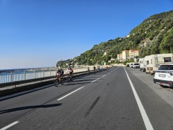 - Riding along the coast with beaches (beach := coast in an urban area) is convenient and often picturesque but the problem is toilet (no natural spots to pee and lots of people everywhere).