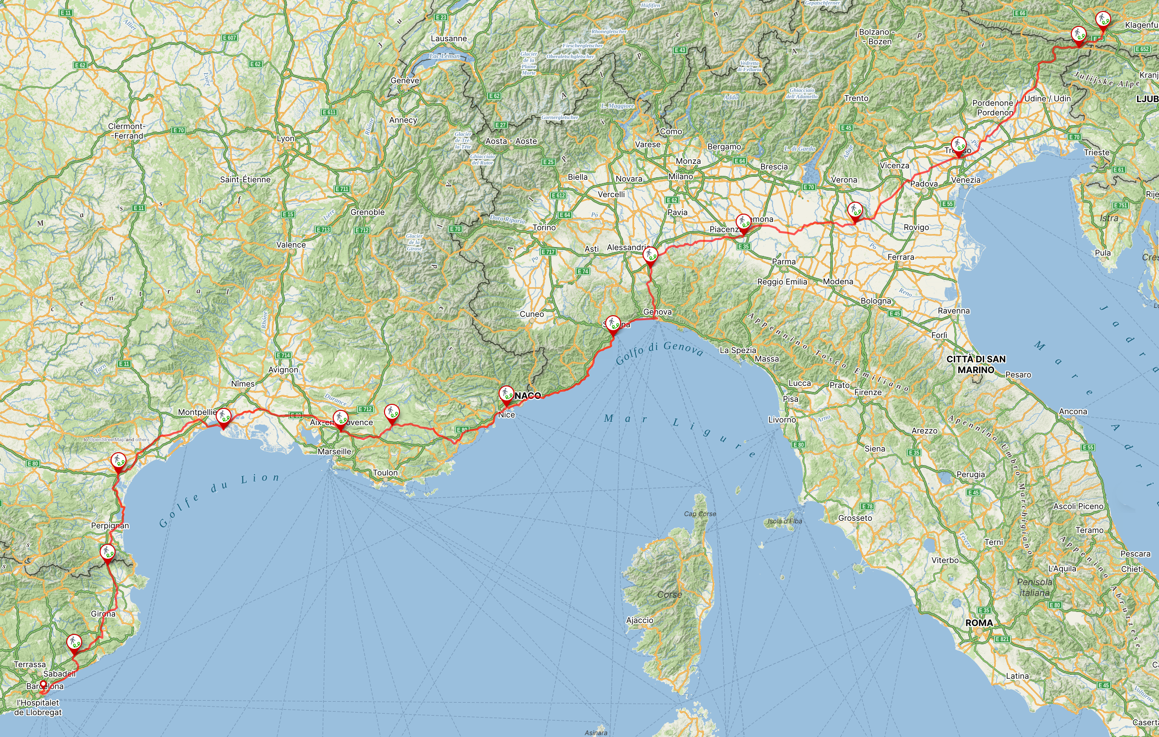 - thus the chosen path was inspired by reachability with train connections from Prague via Vienna – the route planning was very rough (e.g. I forgot to download offline maps for Lombardia), intentionally, I didn’t know how far and how fast would I cycle